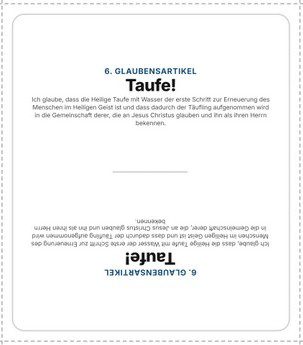 „Hau Drauf!“: Jeder Spieler erhält einen gut gemischten Kartenstapel mit den zehn Glaubensartikeln, die mit der Rückseite nach oben auf einem Stapel vor ihm liegen. Der Erste deckt eine Karte auf und sagt eine der zehn Überschriften (Vater, Jesus, Heiliger Geist, Apostel, Amt, Taufe, Abendmahl, Versiegelung, Wiederkommen, Gehorsam), unabhängig davon welche auf seiner Karte steht. Dann geht es solange Reih um, bis ein Spieler dieselbe Überschrift wie auf der Karte nennt. Alle müssen so schnell wie möglich mit den Händen auf diese Karte hauen. Der Langsamste bekommt die Karte und das Spiel ist zu Ende, wenn einer alle Karten hat. Zwei Varianten dieses Spiels stehen zur Auswahl: die zehn Glaubensartikel oder die zehn Gebote.