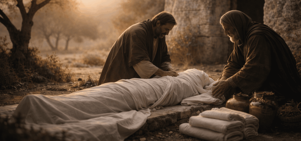 Während die Jünger sich aus Angst zurückziehen, treten Nikodemus und Josef von Arimathäa hervor. Nicht mit Worten, sondern mit einer Tat, die sichtbar macht, was im Verborgenen gereift ist. Gemeinsam sorgen sie für die Bestattung Jesu.