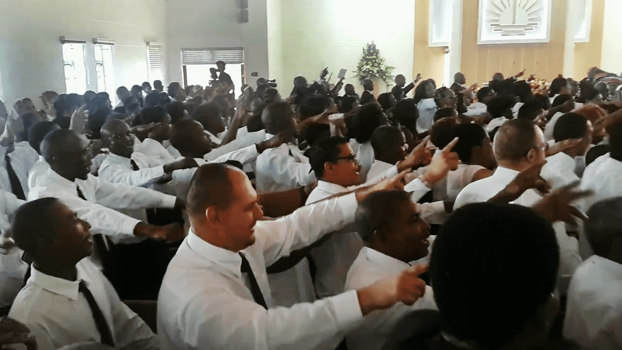 Port Elizabeth, Südafrika, 25. Januar 2015: Stammapostel Jean-Luc Schneider hat den Gottesdienst beendet und schickt sich an, das Kirchenschiff zu verlassen. Und der Chor – singt?